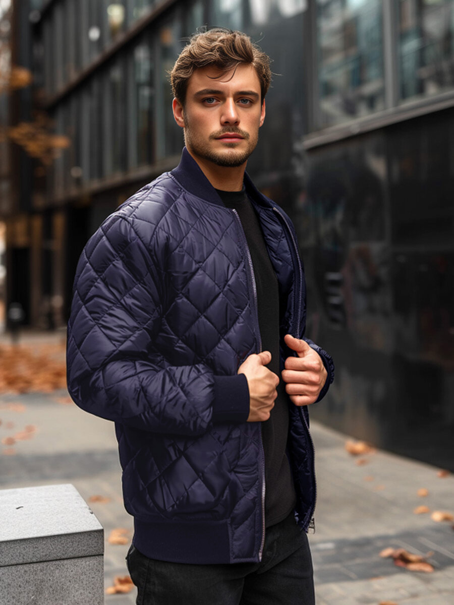 Geacă bleumarin bombers Bolf MY-01A2 un model excelent. Geaca este stilată și practică poate fi de asemenea purtată in mai multe sezoane. Geaca se va înscrie ideal in trendurile modei actuale, confectionata din material plăcut la atingere Este matlasată in romburi. Are guler tip tunică cu inchidere la fermoar. Mânecile, gulerul cu finisare elastice negre Jacheta bomber are două buzunare exterioare practice cu fermoar. De asemenea, are un buzunar suplimentar cu fermoar pe mâneca stângă.