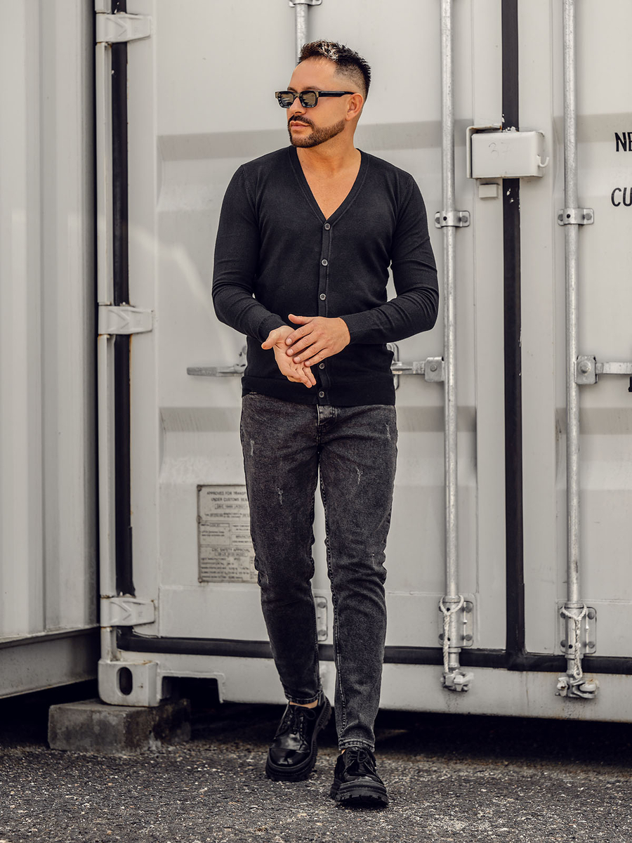 Cardiganul negru pentru bărbați Bolf YY06A este o alegere perfectă pentru bărbații care apreciază eleganța clasică. Închiderea cu nasturi iar finisarea la mâneci cu elastic. Datorită elasticității produsului se așează excelent pe siluetă. Destinat fanilor ținutelor zilnice. Se va potrivi la plimbare, intalnire cu prietenii sau ieșiri in oraș. Confecționat din 32% acril, 27% poliester, 23% nylon 18% vascoză. Va arăta excelent în combinare cublugi sau pantaloni.